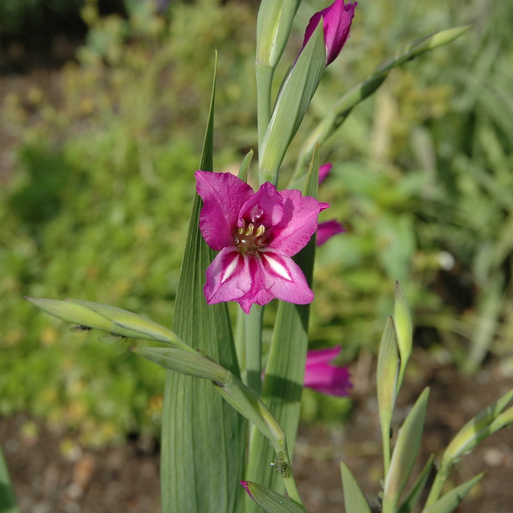 Gladiolus imbricatus — багаторічна трав'яниста рослина родини півникових. Має подвійну бульбоцибулину, оточену тонковолокнистою з паралельними волокнами оболонкою. Стебло прямостояче, просте, облистнене, 55—120 см заввишки. Нижні листки — піхвові, лусковидні; стеблові — лінійно-мечовидні, на верхівці загострені, 5—20 мм завширшки, в кількості 4—5, з яких 1—3 верхівкові вкорочені; нижній — найширший, часто — тупий. Квітки в кількості 5—12 зібрані в однобічний негустий колос; оцвітина шестироздільна, неправильна, 25—35 мм завдовжки, рожево-лілова з синюватим відтінком. Плід — коробочка. Цвіте червні — серпні.