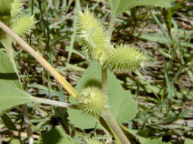 Однорічна трав'яниста шорстка сірувато-зелена з неприємним запахом рослина родини айстрових (складноцвітих). Стебло прямостояче, розгалужене, бурувате, вгорі залозисте. Листки чергові, черешкові, округло-трикутні або яйцевидні, при основі серцевидні, надрізанозубчасті, часто 3—7-лопатеві. Квітки трубчасті, дрібні, зеленаві, одностатеві (рослини однодомні), зібрані в кошики, що розміщені в пазухах листків пучками; кошики з тичинковими квітками — багатоквіткові, оточені обгорткою з однакових листочків; з маточковими — двоквіткові, їхня обгортка зрослолиста. Обгортка плодів сіро-зелена, овальна до основи і до верхівки звужена, 10—15 мм завдовжки і 5—9 мм завширшки, на верхівці — з двома прямими розставленими або зближеними колючками, рідко вкрита шипиками, які не доходять до верхівки обгортки. Плід — сім'янка. Цвіте у липні — серпні.