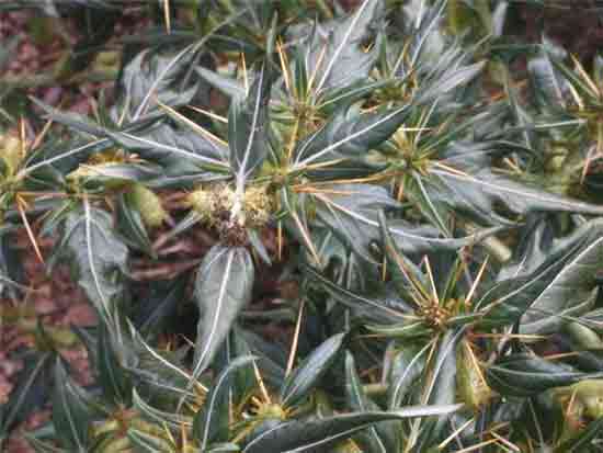 Однорічна трав'яниста шорстка рослина родини айстрових (складноцвітих), заввишки 30—50 см. Стебло прямостояче, тонкоребристе, дуже розгалужене, коротковолосисте, біля основи листків має одну або. дві трироздільні міцні жовті колючки. Листки чергові, короткочерешкові, глибоко три-, п'ятилопатеві, при основі клиновидні, зверху темно-зелені, зісподу — білоповстисті. Квітки трубчасті, дрібні, жовтаві, одностатеві (рослини однодомні), зібрані в кошики, що розміщені по одному в пазухах листків; кошики з тичинковими квітками — багатоквіткові, з обгорткою з однакових вільних листочків; з маточковими — двоквіткові, зі зрослолистою обгорткою. Обгортка плодів жовтаво-бурувата, видовжено еліптична на верхівці — з 1—2 прямими тонкими колючками, густувато вкрита міцними колючими шипами. Плід — сім'янка. Цвіте у липні — серпні.