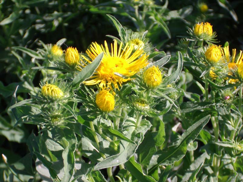 Inula britannica -багаторічна трав'яниста сіро-зелена або зеленувата рослина родини айстрових (складноцвітих). Має тонке косо повзуче кореневище. Стебла висхідні або прямостоячі, густо облистнені, 15-18 см заввишки, вгорі розгалужені й під кошиками білоповстисті, внизу розсіяно м'яко опушені. Листки чергові, цілісні, широколанцетні, коротко загострені, по краю дрібнозарубчасті, рідше цілокраї, зверху голі або розсіяно-волосисті, зісподу густіше вкриті прилеглими довгими тонкими білими волосками і, крім того, дрібними жовтими залозками; нижні - до основи поступово звужені в крилаті черешки, серединні і верхні - сидячі, напівстеблообгортні, нерідко з вушками. Квітки блідо-жовті, зібрані в невеликі (2,5-3 см у діаметрі) кошики, що утворюють на верхівці стебла нещільне щитковидне суцвіття; крайові язичкові квітки - жіночі, голі, гладенькі, на верхівці - тризубчасті, серединні - двостатеві, трубчасті. Плід - сім'янка. Цвіте у червні - вересні.