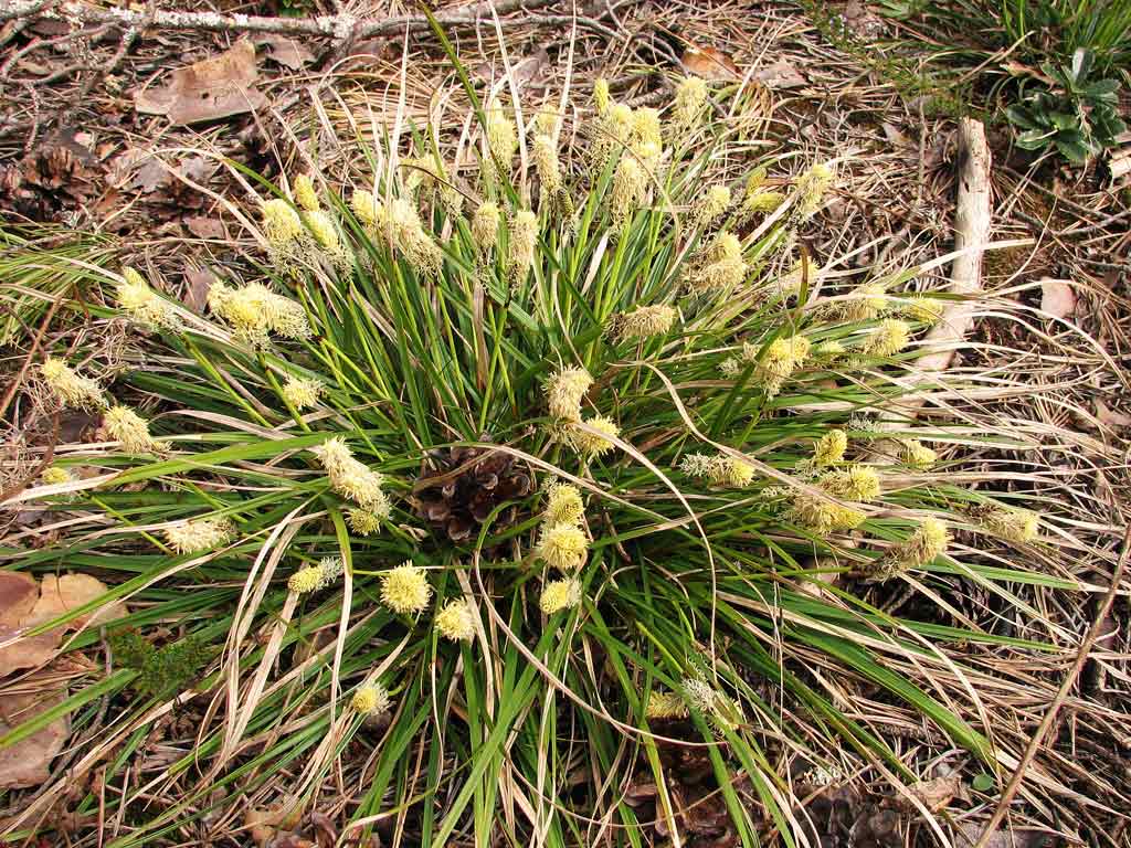 Багаторічна трав'яниста зимовозелена щільно (на відкритих місцях) або пухкодерниста (в лісах) рослина родини осокових. Має косе, міцне, розгалужене кореневище, вкрите шорсткими лусками. Стебла сплюснуто-тригранні, 30—45 см заввишки, у верхній частині шорсткі, в нижній третині — облистнені, при основі одягнені бурими розщепленими на волокна листковими піхвами. Листки трирядні, лінійні (5—7 см завширшки і 40—50 см завдовжки), зелені з сизуватим відтінком, жолобчасті, з двома жилками і загорнутими наспід краями. Квітки одностатеві (рослини однодомні), без оцвітини, зібрані в 2—3 розсунуті колоски. Верхній колосок тичинковий, коричневий, булавовидний, 1,5—2 см завдовжки. Нижні колоски маточкові, зеленаво-коричневі, яйцевидні, 1,5—2,5 см завдовжки, на прямих міцних шорстких ніжках, що виходять з пазух приквіткових листків; покривні луски з шиловидним вістрям, каштанові, посередині зелені, з трьома жилками. Плід — горішок, що міститься в обернено-яйцевидному, круглястому (до 5 мм завдовжки), жовтаво-зеленому, з невиразними жилками, вкритому негустими щетинками мішечку, звуженому на верхівці в короткий іржавий, з шорстким краєм носик. Цвіте у квітні.
