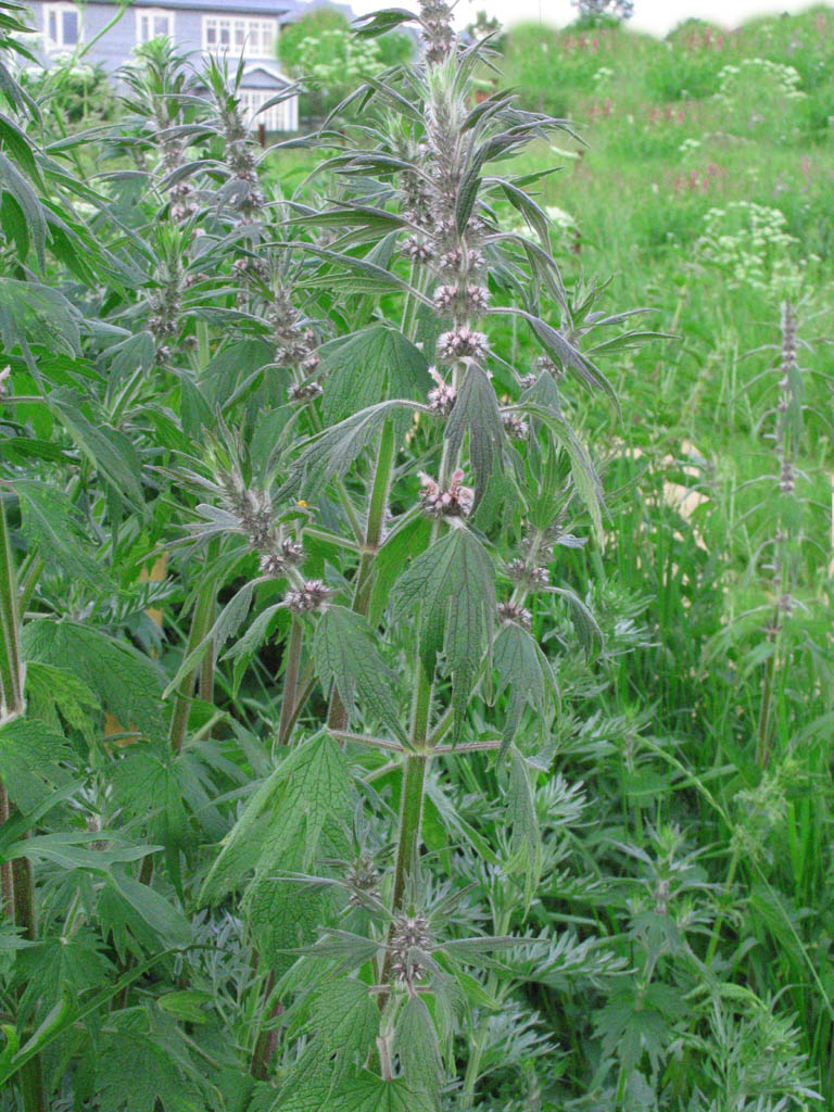 Багаторічна трав'яниста рослина родини губоцвітих. Стебло прямостояче, 25—100 см заввишки, розгалужене, чотиригранне, як і вся рослина опушене відстовбурченими волосками. Листки навхрест супротивні, черешкові; зверху яскраво-зелені, зісподу — білувато-повстисті; нижні — округлі або яйцевидні, з серцевидною основою, верхні — довгасті, трироздільні або трилопатеві, з клиновидною основою. Квітки неправильні, сидячі, зібрані густими кільцями в пазухах листків на верхівках пагонів; віночок двогубий, блідо-рожевий. Плід з 4 однонасінних горішковидних часточок. Цвіте у червні — вересні.