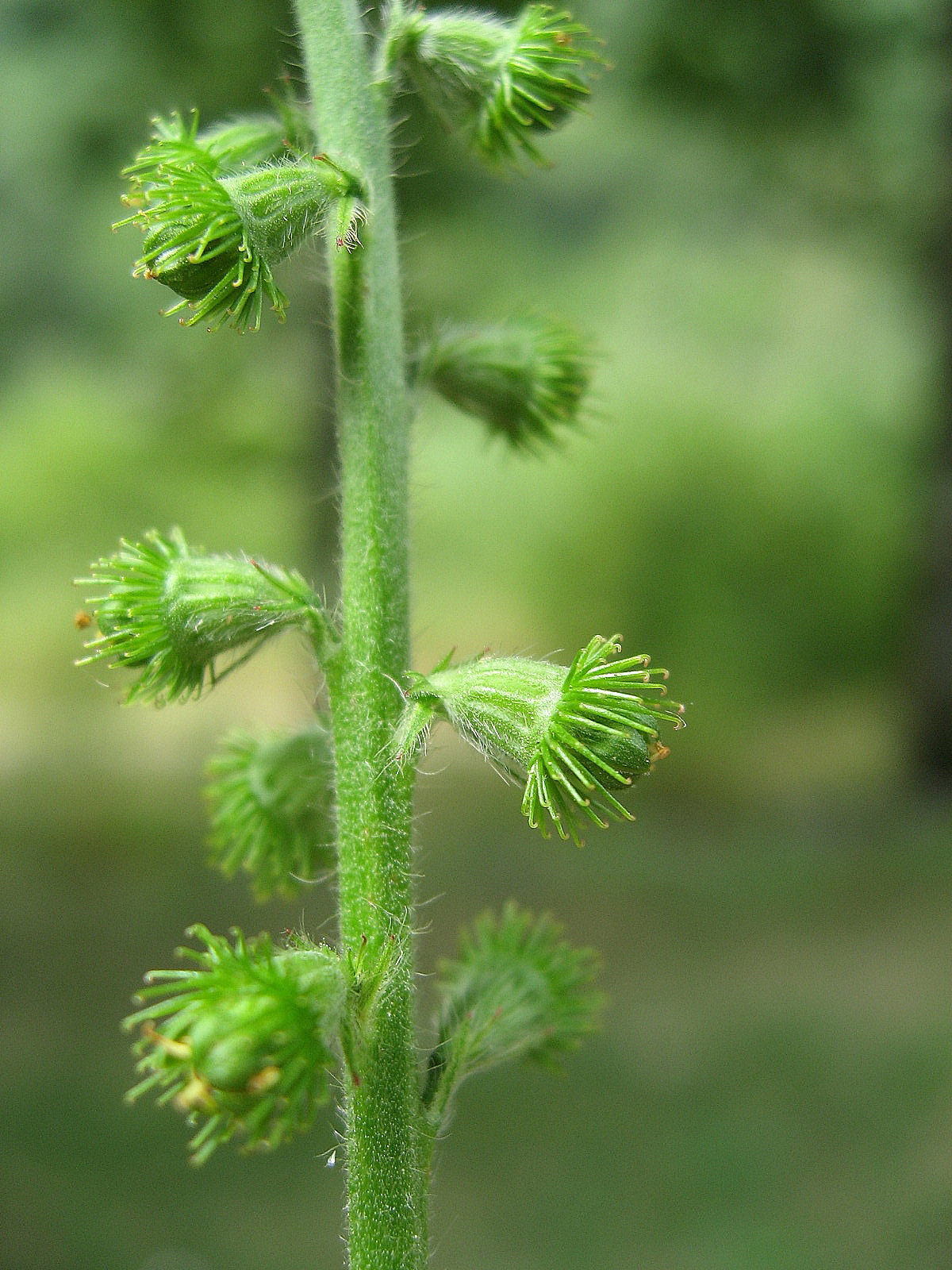 Багаторічна трав'яниста рослина родини розових. Має більш-менш слабке горизонтальне кореневище з численними додатковими коренями на ньому. Стебло 25—150 см заввишки, прямостояче, просте або вгорі трохи розгалужене, борозенчасте, вкрите, як і черешки листків, довгими рідкими відхиленими волосками, що сидять на буруватих горбочках. Листки чергові, перервано непарноперисті, зверху темно-зелені, голі, зісподу ясно-зелені, по жилках волосисті й на всій поверхні більш-менш залозисті; нижні та серединні листки черешкові, верхівкові — сидячі; листочки (їх 5—7, рідше 9) сидячі, ромбічно – обернено-яйцеподібні або майже ланцетні, до основи клиновидно звужені й цілокраї, від середини до верху з (3)4— 5(7) великими загостреними або тупуватими зубцями й такою самою кількістю жилок з кожного боку та одним трохи більшим за бокові загостроним або тупуватим кінцевим зубцем; проміжні часточки, що є між листочками, видовжено-яйцевидні, частіше цілокраї. Прилистки майже цілокраї, напівсерцевидні й стеблообгортні. Квітки правильні, двостатеві, 5-пелюсткові, зібрані колосовидною китицею на верхівці стебла; пелюстки видовжені, блідо-жовті. Плід складається з 1— 2 горішків, вміщених у гіпантій дзвоникуватий, з глибокими борозенками, що доходять майже до його основи, розсіяно-волосистий, угорі під чашечкою 3 багаторядним колом догори спрямованих і зближених над плодом у вигляді конуса гачковидно зігнутих шипиків. Цвіте у червні — липні.