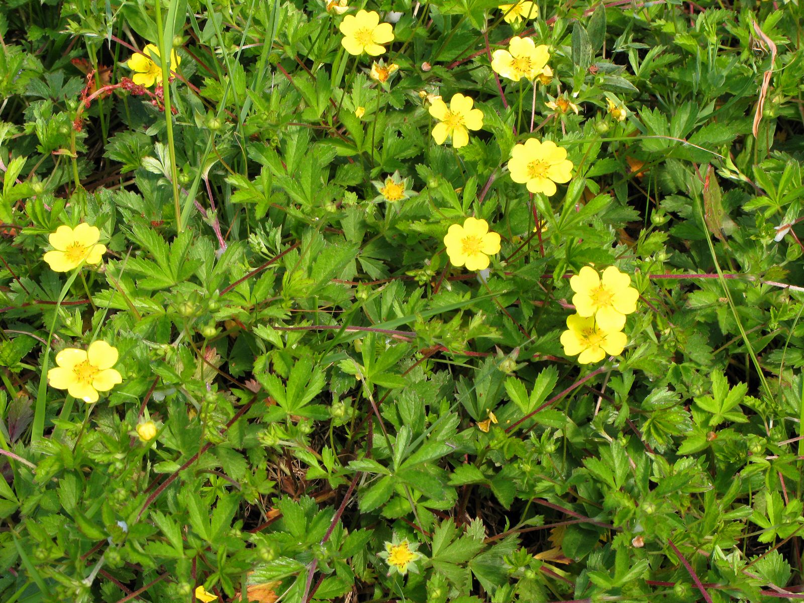 Багаторічна трав'яниста рослина родини розових. Стебло лежаче, з повзучими або сланкими пагонами, 10—70 см завдовжки. Листки довгочерешкові,пальчасті, з 5—7 листочками, зверху голі, зісподу притиснутоволосисті. Квітки двоостатеві, правильні, 18—25 мм у діаметрі, жовті, одиничні, зрідка по 2 на довгих (3,5—8,5 см завдовжки) прямостоячих квітконіжках, більших за черешки стеблових листків; чашолистків і пелюсток по п'ять. Плід складається з горішковидних сім'янок; зав'язь і сім'янки голі. Цвіте у червні—липні.
