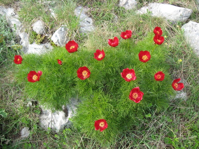 Багаторічна трав'яниста рослина родини півонієвих. Має кореневище з потовщеними у вигляді довгастих шишок, що сидять на коротких ніжках, коренями. Стебла прості, голі, 20—50 см заввишки. Листки двічі або тричі перисто-розсічені на вузькі (1 — 2 мм завширшки), лінійно-нитковидні цілокраї частки. Квітки правильні, двостатеві, великі (до 8 см у діаметрі), 0диничні на верхівці стебла; пелюсток 8—10, вони криваво-червоні. Плід складається з 2—5 багатонасінних повстистоопушених листянок. Цвіте у травні.