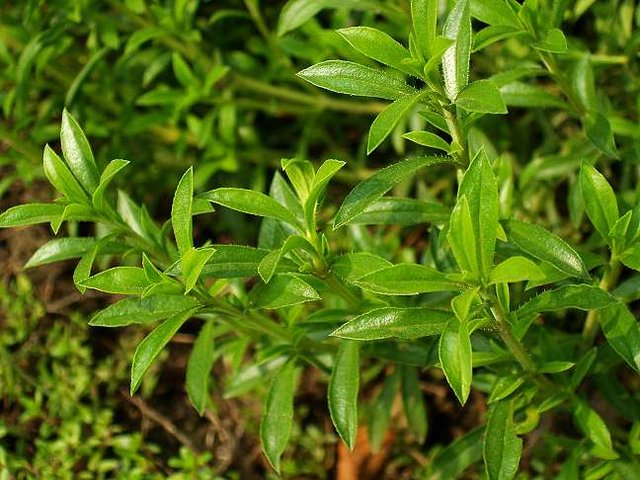 Satureja hortensis — однорічна, рідко дворічна рослина родини губоцвітих. Стебла прямостоячі, 15—35 см, в екземплярів, що перезимували, до 60 см заввишки, галузисті, опушені короткими, але багатоклітинними, вниз відігнутими волосками, при основі часто здерев'янілі. Листки супротивні, майже сидячі, лінійно-ланцетні, клиновидно звужені до основи, цілокраї, здебільшого тупі, з обох боків або лише зісподу розсіянокоротковолосисті, крапчастозалозисті. Квітки двостатеві, неправильні, утворюють 3—5-квіткові пазушні несправжні кільця, верхні з яких зближені на кінці стебла та гілок; чашечка дзвониковидна, зовні розсіяноволосиста, зелена або лілувата, з 10 жилками і 5 ланцетними загостреними зубцями, що майже дорівнюють трубочці; віночок світло-ліловий, рожевий або білий, двогубий, з плоскою, виїмчастою верхньою губою і трилопатевою нижньою, середня лопать якої виїмчаста. Плід складається з чотирьох однонасінних горішковидних часток. Цвіте у липні-серпні.