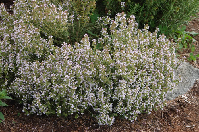 Thymus vulgaris — невеликий (до 50 см заввишки) півкущик родини губоцвітих. Стебло прямостояче або підведене, дуже гіллясте, в нижній частині здерев'яніле; гілки трав'янисті, тонкі, чотиригранні, сірувато опушені. Листки дрібні (5—10 см завдовжки), супротивні, короткочерешкові, видовжено-ланцетовидні, сіруваті, густо опушені, цілокраї, з крапчастими залозками і загорнутими донизу краями, дуже запашні. Квітки дрібні, неправильні, в пазушних півзонтиках, що утворюють несправжні кільця, зібрані у рихлі китицевидні суцвіття; віночок двогубий, лілувато-рожевий, рідше білий. Плід складається з чотирьох однонасінних горішкоподібних часток. Цвіте у червні — липні.