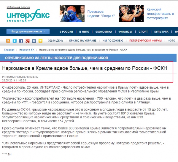 "Інтерфакс" повідомив, що "Наркоманів у Кремлі вдвічі більше, ніж у середньому по Росії - ФСКН".