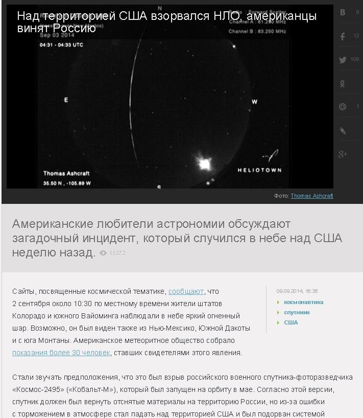 На офіційному сайті НТВ, з'явилась стаття про те, що насправді над територією Америки вибухнув неопізнаний літаючий об'єкт, а не російський супутник.