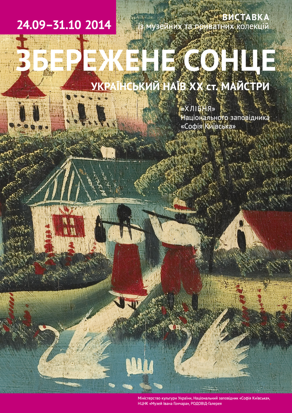 ЗБЕРЕЖЕНЕ СОНЦЕ – перша виставка проекту УКРАЇНСЬКИЙ НАЇВ ХХ СТ., на якій представлена творчість найвідоміших непрофесійних художників – Панаса Ярмоленка, Марії Примаченко, Катерини Білокур, Григорія Ксьонза, групи полтавських кустарів, Івана Лисенка, Марії Нелеп та багатьох інших. Творчість цих мистців припала на жорсткі 1920-ті, голодні, колективізаційні 1930-ті, воєнні 1940-ві (та й інші не були легкими для українців), але і в найбезнадійніші десятиліття вони створювали яскраві фантастичні твори, в яких багато сонця, щирості, високої і гордої радості духу. Про них можемо сказати, як Луї Арагон про Анрі Матісса, що вони зберегли сонце для молоді у темні часи. «Збережене сонце» – одне із пояснень того, чому в майстернях професійних мистців так часто зустрічаються наївна картина, ікона, скульптура чи витинанка. Інші пояснення – у словах сучасних українських художників, яких ми запросили до проекту. Вони працюють у глобальному контексті, подорожують світом, виставляються в галереях Європи, Америки, Японії і, разом з тим, чар наїву має до їхніх сердець «найкоротшу дорогу» (слова Арсена Савадова). Ми хотіли через їхній світ, їхнє розуміння побачити творчість «наївних» колег і зрозуміти все про збережене і для них сонце.