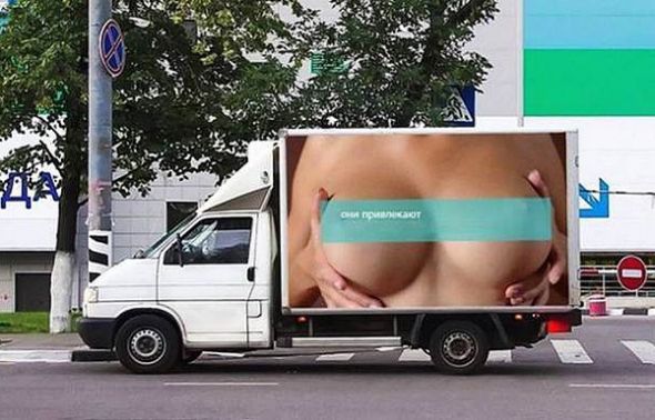 Реклама з зображенням оголених жіночих грудей стала причиною понад 500 ДТП в Москві протягом одного дня. В рамках піар-компанії збоку 30 фургонів була зображена жінка з оголеними грудьми, яку прикривала лише тонка синя смужка. Зображення супроводжував напис: "Вони притягають".