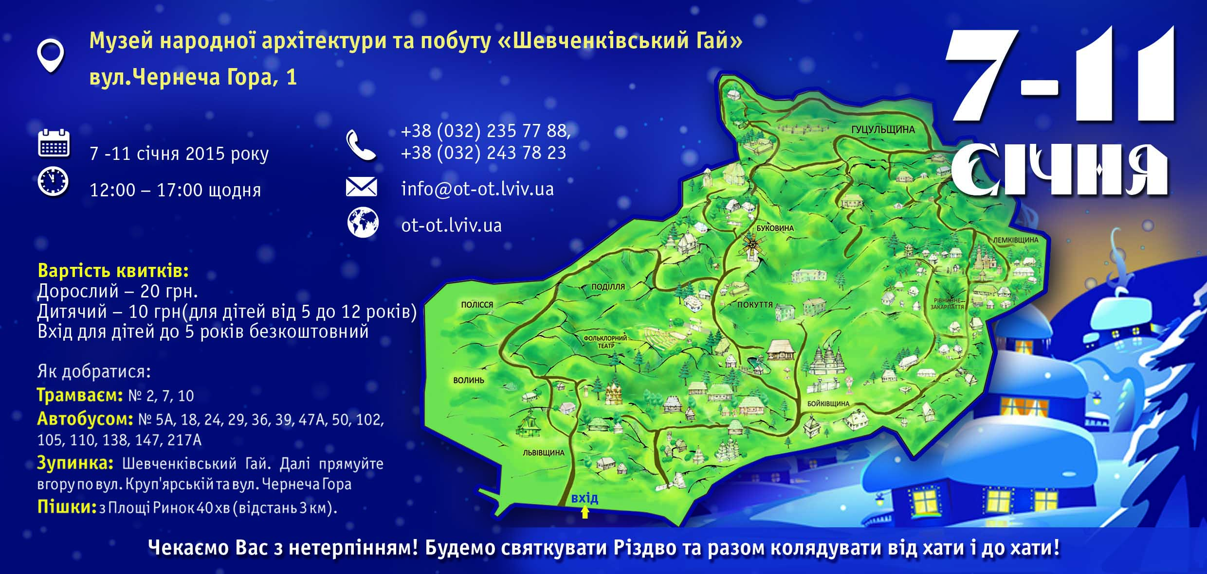 У час Різдвяних свят, з 7 по 11 січня, в Музеї народної архітектури та побуту «Шевченківський гай» відбудеться свято «Різдво в Гаю». Вартість вхідного квитка – 20 грн., діти 10 грн. Як зазначають організатори, половина коштів із вартості квитка, буде скеровано на реставрацію пам’яток Музею народної архітектури та побуту «Шевченківський гай».