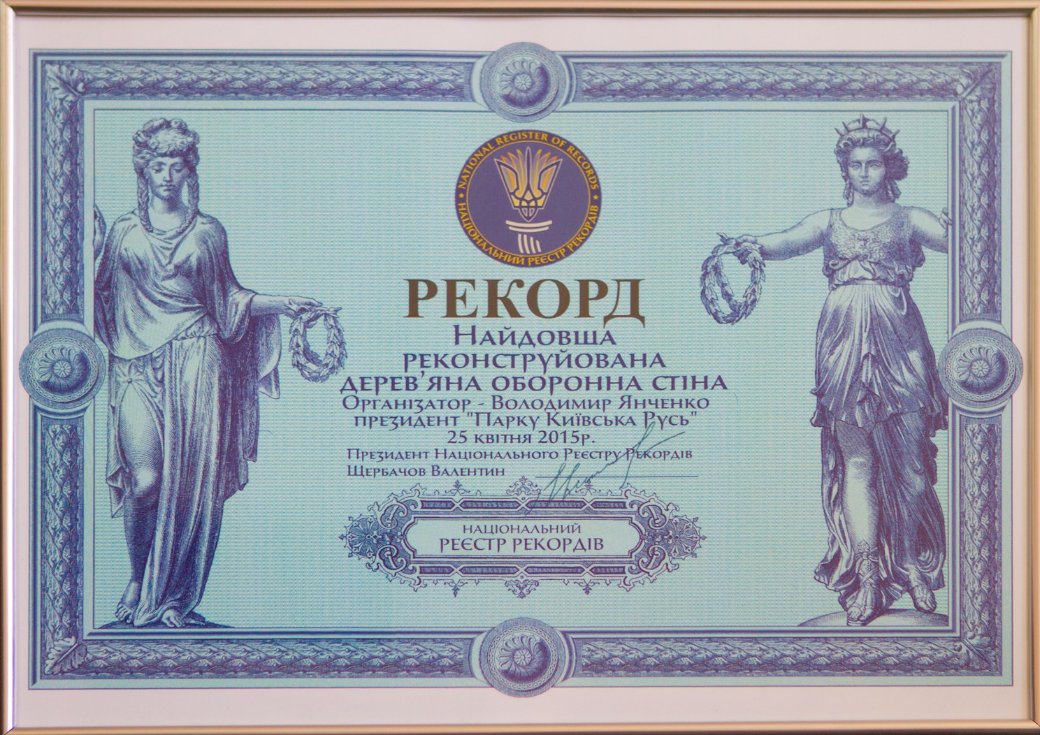 Диплом, що посвідчує рекорд, вручив президенту «Парку Київська Русь» Володимиру Янченку експерт Національного реєстру рекордів України Віталій Зорін. «Ми очікували, що буде розмах, але не думали що він буде настільки великим, – сказав експерт. – Сьогодні ми провели офіційне перше замірювання фортечної споруди у вигляді дерев'яної реконструйованої. По внутрішньому радіусу з урахуванням поворотів результат вийшов двісті вісімдесят шість метрів і 90 сантиметрів. Це новий рекорд України, нічого подібного в нашій країні не існує. І, я так думаю, що якщо ми зробимо вивчення і відправимо всі необхідні дані в Лондон, то у нас є всі шанси вже в цьому сезоні підтвердити міжнародний статус цього досягнення і потрапити в книгу рекордів Гінесса, яка вийде в 2016-му році. Що ж стосується Національного реєстру рекордів, то вже в листопаді вийде нова книга рекордів України і це досягнення займе в ній гідне місце».