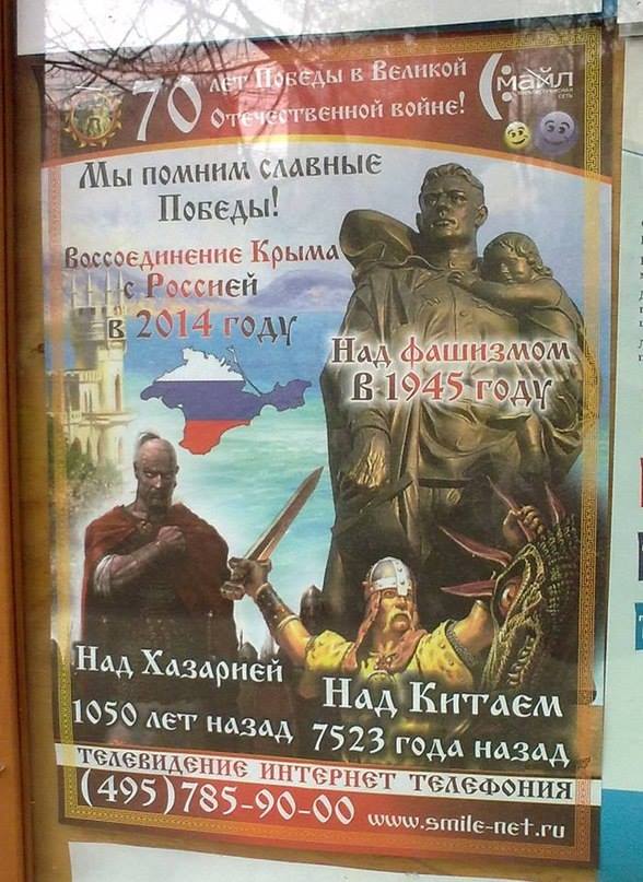 Разом з "перемогою над Китаєм" семитисячолітньої давності на банері згадується також "перемога над Хазарією 1050 років тому і, природно, захоплення російськими диверсантами і військовими українського Криму в 2014 році.