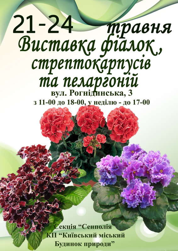 Травень – період рясного квітування. Саме в цей час рослини виявляють свої яскраві сортові особливості – коли ще немає пекучого сонця і бруньки набрали цвіту за сприятливі погодні умови. Травень і червень – це справжній фестиваль для стрептокарпусів та сенполій. Відвідувачі також зможуть помилуватися рясним квітуванням пеларгоній та новими сортами епісций. В програмі виставки безкоштовні майстер-класи: