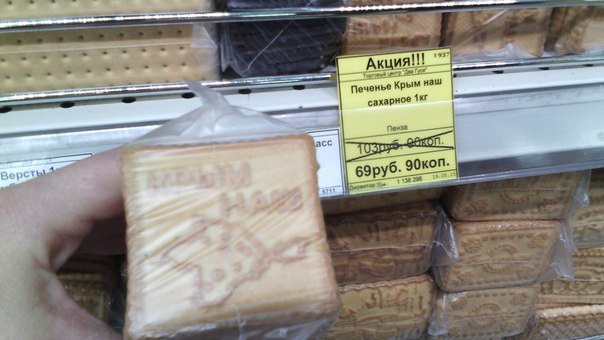 У магазинах російського міста Пенза з'явилося печиво "Кримнаш". На ньому зображений контур півострова і відповідний напис. Коштує воно цілком бюджетно - 103 руб / кг (близько 25 грн). Але, судячи з усього, великим попитом не користується, так як продають печиво за аукціонною ціною 70 руб / кг.