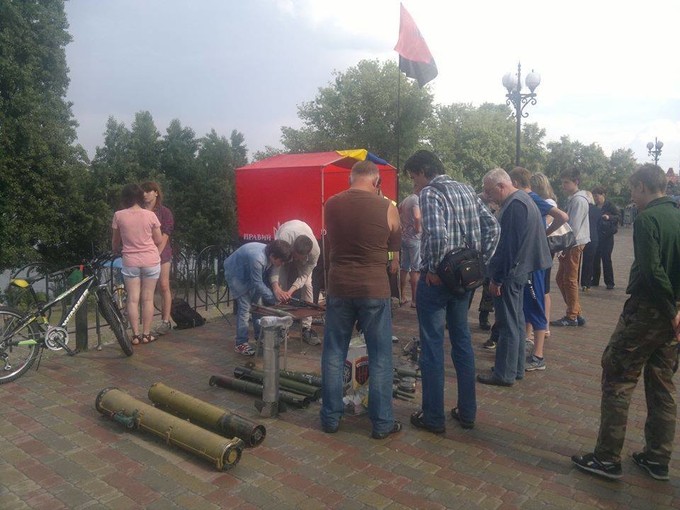 У минулі вихідні (30-31 травня) активісти "Правого сектора" в Києві за підтримки райдержадміністрації провели на Оболонській набережній патріотичну акцію, в рамках якої представили невелику виставку зброї та предметів із зони проведення антитерористичної операції на Донбасі, повідомляє gordonua.com з посиланням на прес-службу "ПС".