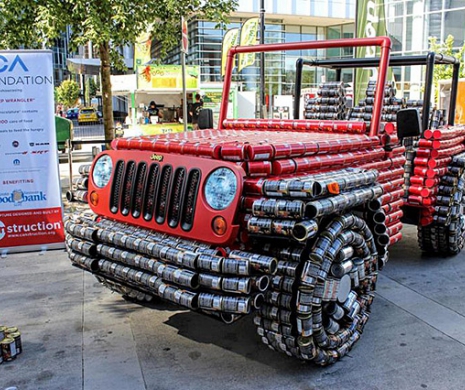На роботу пішло 12 годин. Після цього 4500 консервних банок перетворилися на повнорозмірну копію позашляховика Jeep. Позашляховик Jeep Wrangler вибрали, бо саме він кілька років є лідером продажів у своєму класі.