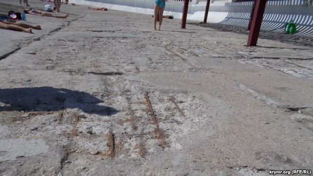 «Вузький бетонний пляж – це півбіди. Найголовніше те, що бетонне покриття абсолютно не ремонтувалося в рамках підготовки пляжів до курортного сезону. Про це свідчать зяючі пробоїни в бетонному настилі: місцями ці дірки настільки глибокі, що з них стирчить металева сітка та іржава арматура», – нарікає Литвиненко.
