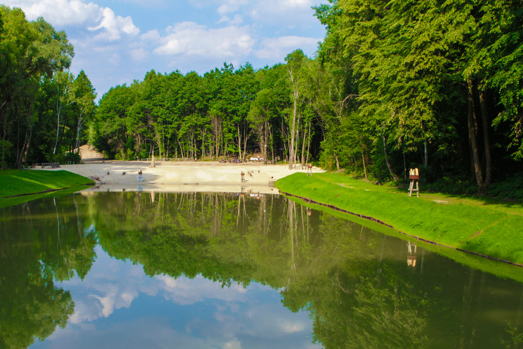 А далі за зеленою чашею газонів – стіною став правічний ліс. Вигляд озеро має просто казковий. Можна годинами милуватися водною гладдю , кронами дерев, що відображаються у ній, і слухати хор лісових птахів. А для тих, хто надає перевагу діям перед спогляданням, з одного боку озера обладнано піщаний пляж, з якого зручно заходити у воду, і де можна безпечно купатись навіть дітям.