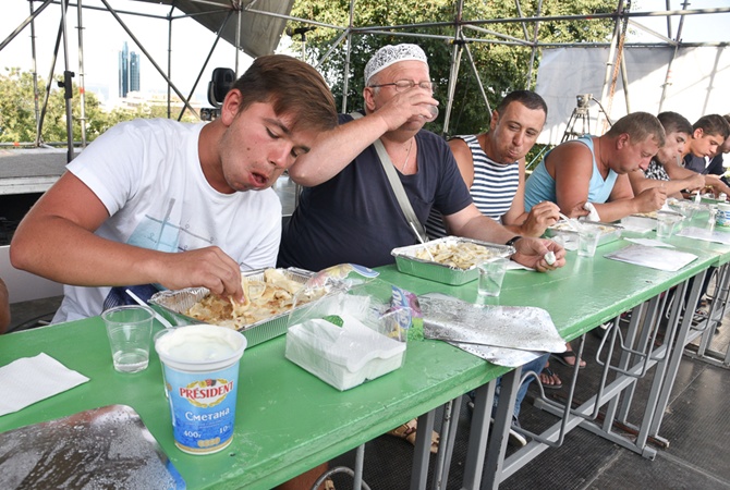 Кулінарний конкурс вже не перший рік влаштовують одеські організатори "Вишиванкового фестивалю". Цього разу тим, хто не проти наїстися досхочу, пообіцяли путівку на дводенний відпочинок в курортному селищі Затока. Охочих позмагатися за головний приз знайшлося чимало - спочатку майже сорок осіб подали заявки на конкурс. При цьому до харчового змагання допускали тільки повнолітніх і впевнених у своїх можливостях людей. Пізніше організатори шляхом випадкового жеребкування відібрали десяточку головних їдців, причому виявилося, що всі десятеро - чоловіки. Деякі не дочекалися оголошення результатів і пішли, а ведучий не упустив можливості пожартувати на цю тему.