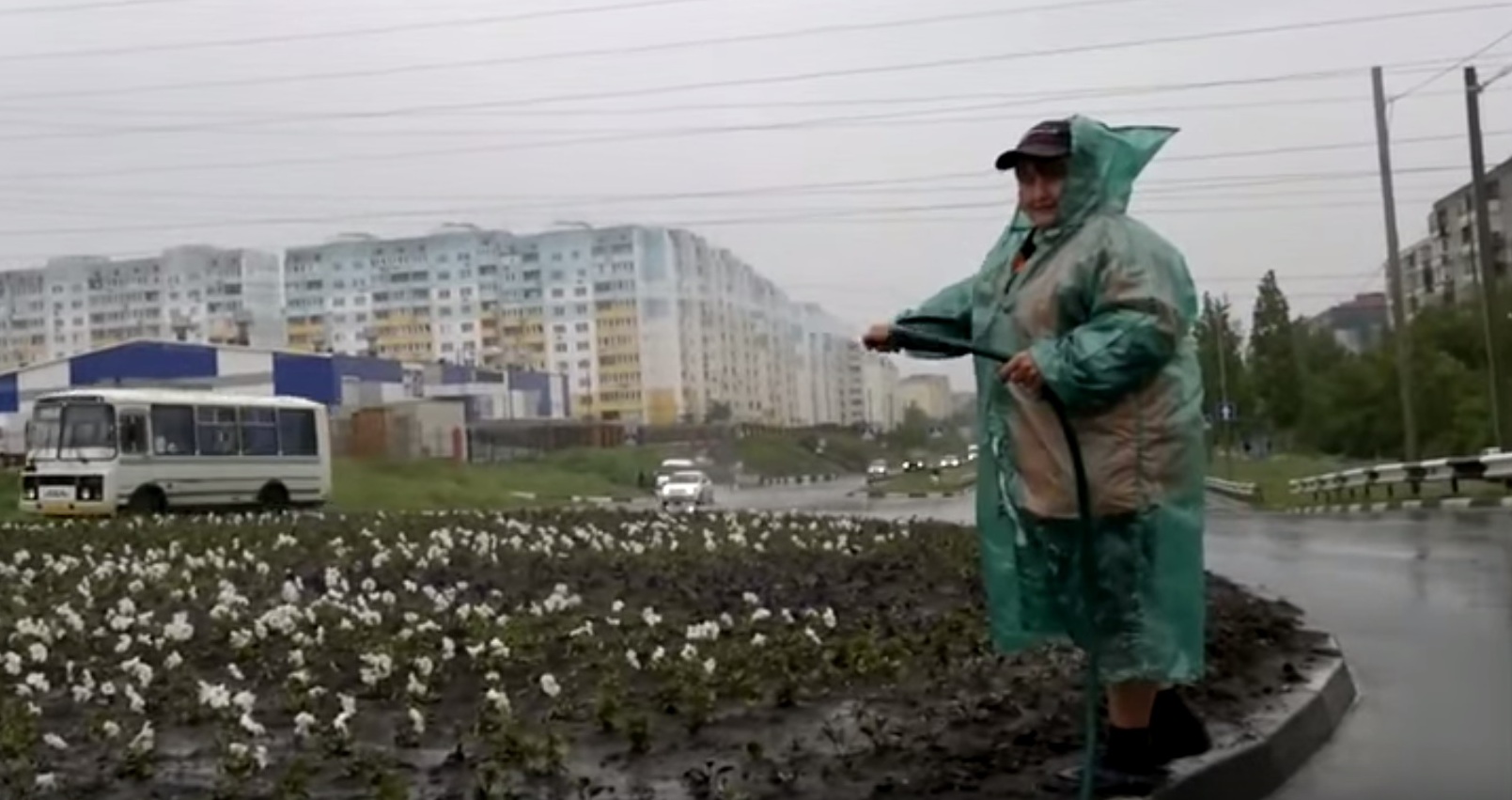 Автор відео намагалась з'ясувати у комунальниці, навіщо вона поливає клумбу, коли на дворі злива. Між ними відбувся наступний діалог: