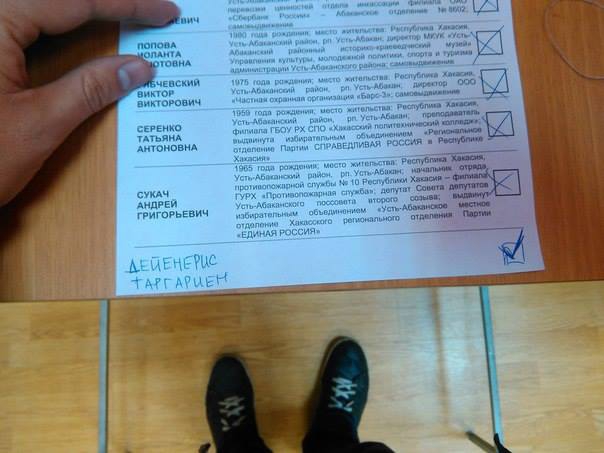 На фото видно, що росіяни на бюлетенях писали імені персонажів популярного серіалу "Гра престолів".