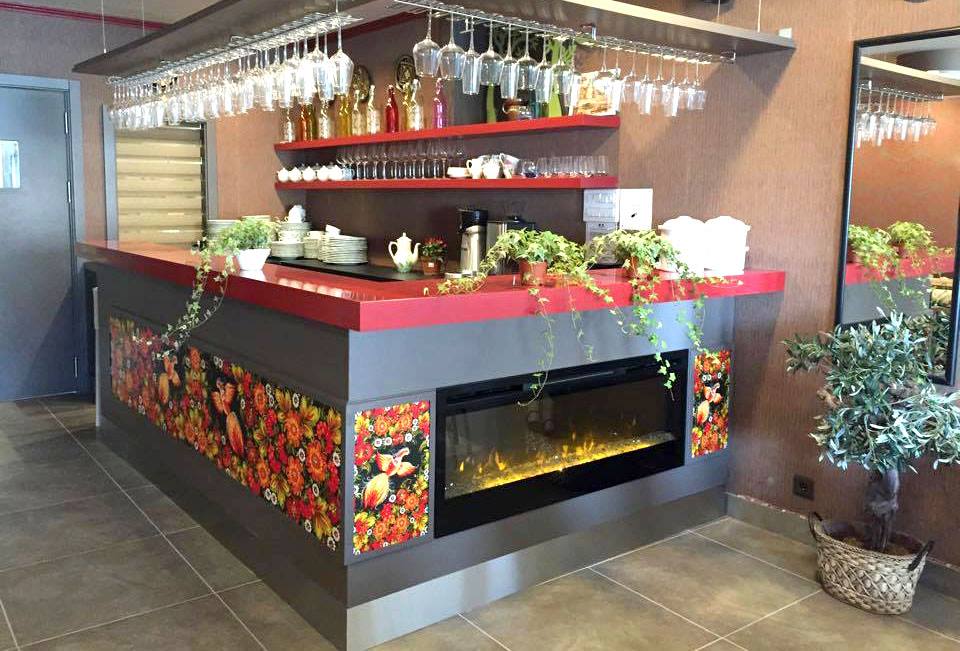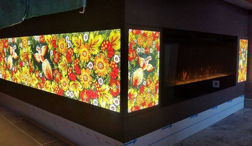 Декоративний розпис, у вигляді дерева життя, прикрашає одну зі стін приміщення. Також розпис використано в оформленні барної стійки-комина. Панелі з розписом вдало підсвічуються, та перетворюються на дуже гарні вітражі. Окрім цього в оформленні інтер'єру використані різноманітні розписані речі.