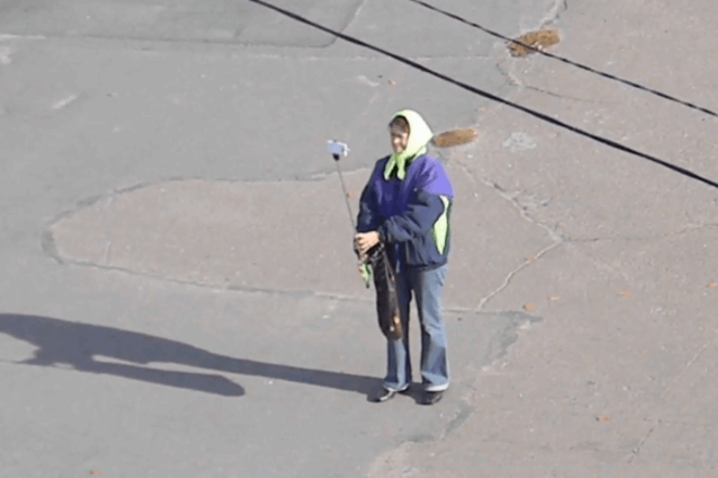 Соціальні мережі «розриває» фото і відео, на якому жінка в хустинці в середмісті Черкас фотографується, використовуючи селфі-палку.