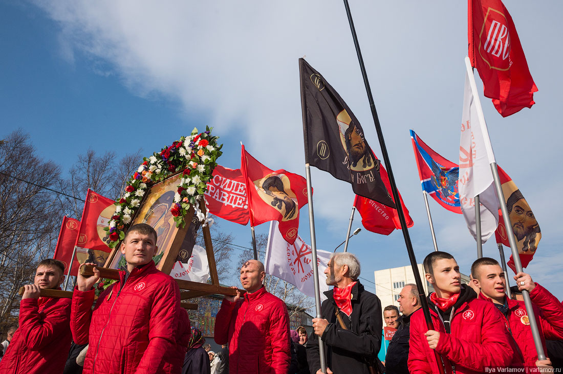«За мірками Южно-Сахалінська було багатолюдно. На чолі ходи несли ікону, за нею йшов губернатор і всі місцеві чиновники. За ними - люди з прапорами Новоросії (тут схоже ще не в курсі, що Новоросії не вийшло), ПВО (Партії Велике Отечество), «Не в силі, а в правді» та ін. Плакатів і лозунгів не було», - написав він.
