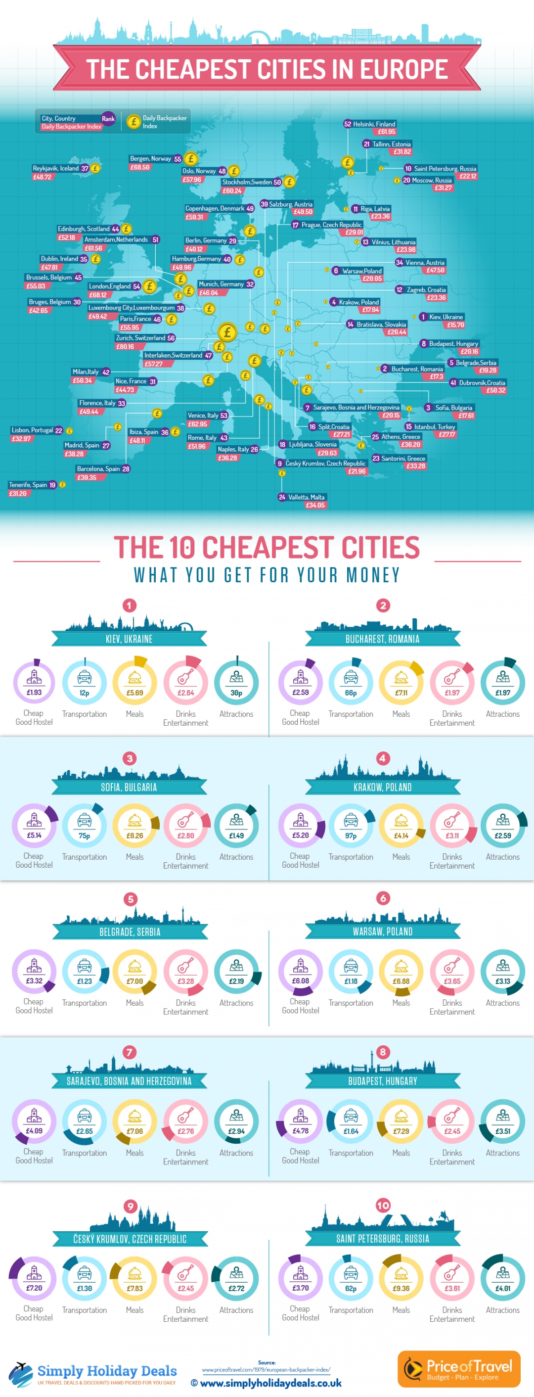 10 найдешевших міст Європи для короткого відпочинку (у порядку зростання цін на проживання, транспорт, харчування і розваги):