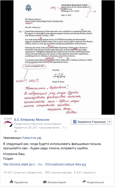 Посольство США в Росії на своїй офіційній сторінці в мережі Фейсбук звернулося до російського видання "Известия" з проханням: перед тим, як публікувати нібито офіційні листи Держдепу, віддавати їх в посольство для виправлення помилок.