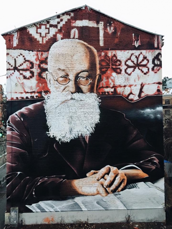 На стіні будинку в центрі Києва намалювали портрет українського історика, громадського та політичного діяча Михайла Грушевського.