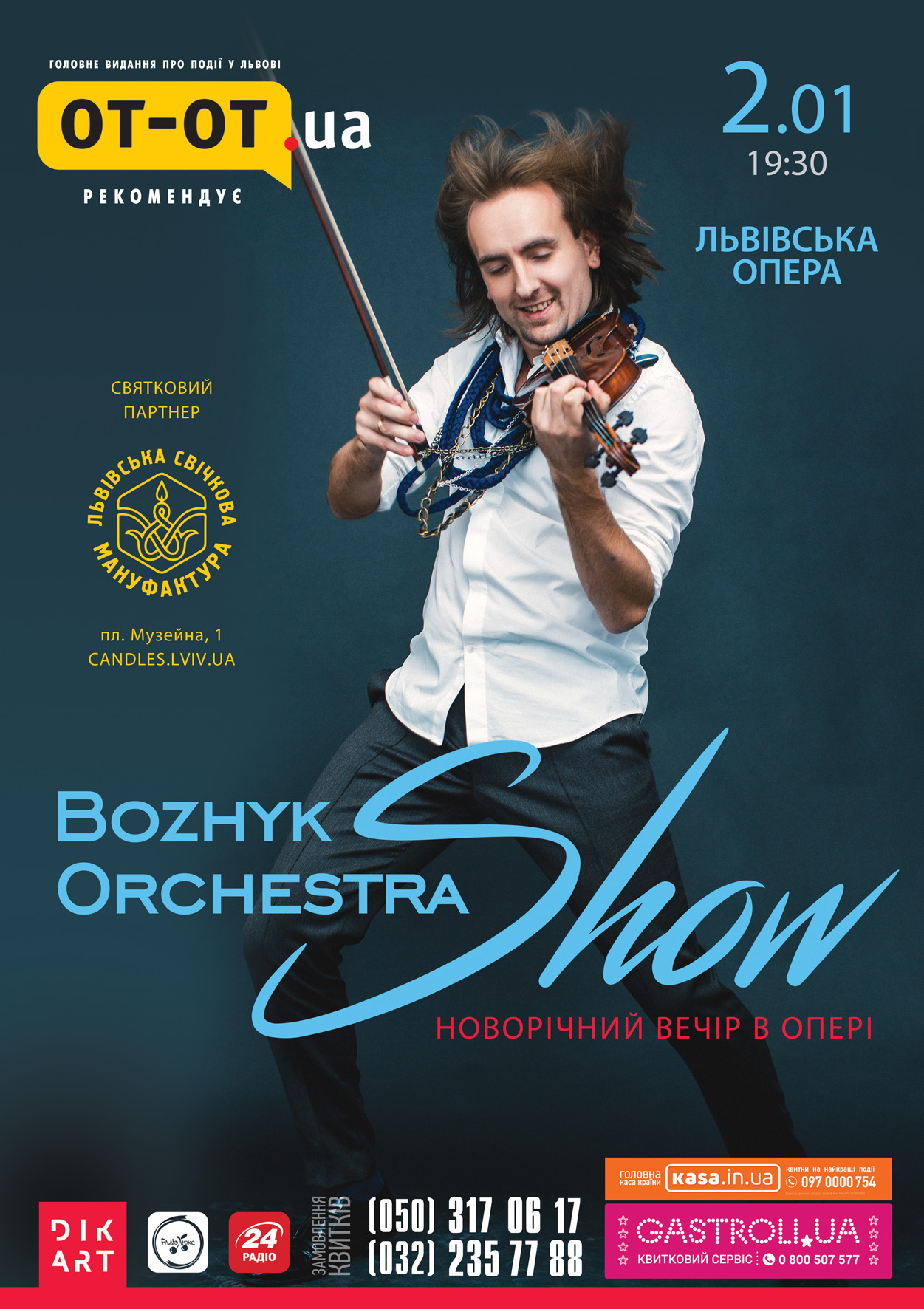 Уже традиційно, 13 років поспіль, компанія «ДікАрт» запрошує провести вечір 2 січня у Львівській Опері. Цього року для львів’ян та гостей міста влаштують Bozhyk Orchestra Show, в якому візьмуть участь віртуозний Олександр Божик з оркестром, рок-групою та унікальними солістами.