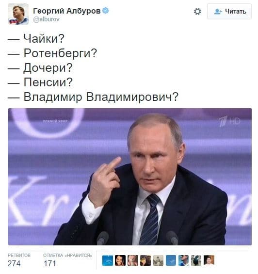 У соціальних мережах тут же назвали непристойний жест Путіна симптоматичним для всіх учасників прес-конференції, де глава РФ уникнув відповідей на слизькі, гострі питання, що стосуються, зокрема, корупції і бандитизму.