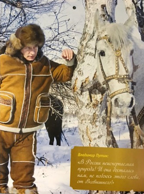 У ньому кожен місяць прославляє президента, який ловить рибу, запалює свічку в церкві, займається спортом, захоплюється російськими жінками тощо.