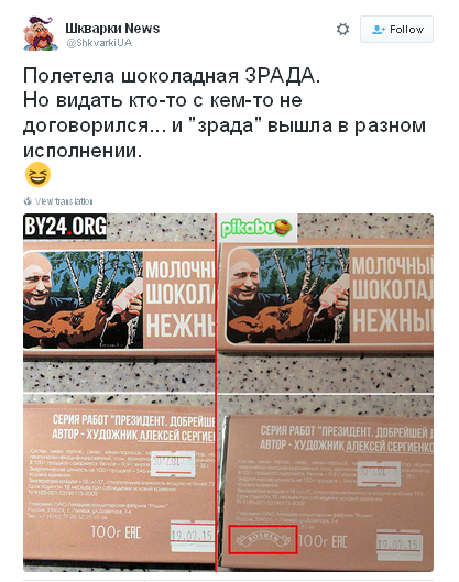 Варто відзначити, що шоколад із серії "Президент. Доброї душі людина», де російський президент Володимир Путін зображений в стилістиці поп-арту, дійсно існує, його виробляють в Санкт-Петербурзі вже більше року.