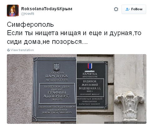 "Сімферополь. Якщо ти злидні злиденна і ще й погана, то сиди вдома, не ганьбися ..." - коментує знімок користувач Twitter RoksolanaToday & Крим, публікуючи для порівняння фото, де показано, як виглядали таблички на будинках до окупації Криму Росією.