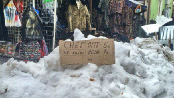 Про це пише видання Сulturemeter. Оскільки великі гори снігу заважають покупцям ходити ринковими рядами, продажі за останній тиждень суттєво знизилися. Тому продавці вирішили вчинити креативно - вони почали "продавати" сніг.