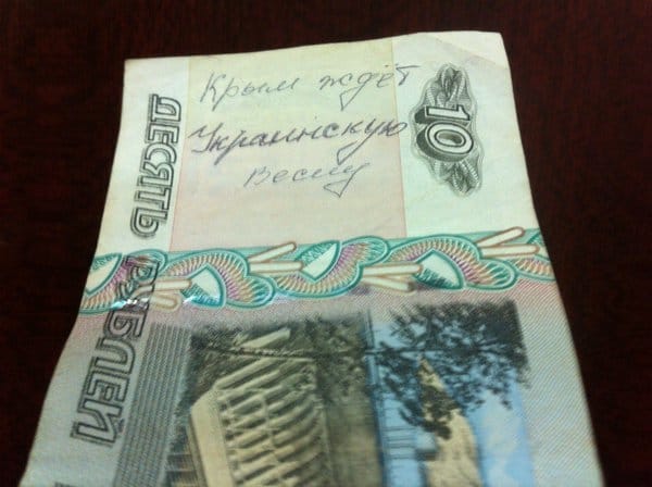 Так в Сімферополі на 10-рублевої купюрі написали "Крим чекає українську весну".