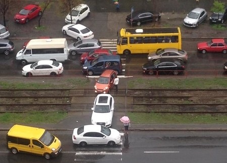 У Дарницькому районі Києва небайдужий водій заблокував автомобіль Audi, водій якого хотіла проїхати через трамвайні колії, порушуючи ПДР, пише obozrevatel.com.