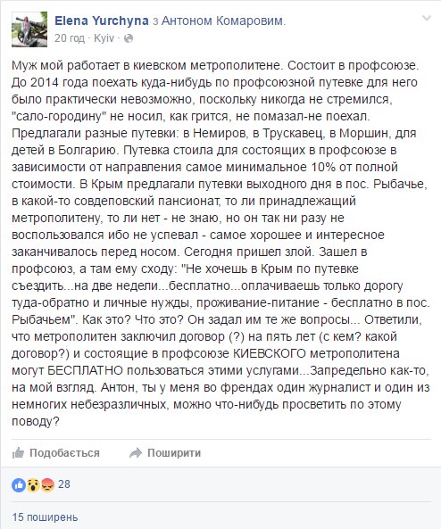 Про це розповіла дружина одного зі співробітників метро Олена Юрчина. ЇЇ чоловік одержав пропозицію безкоштовної путівки до пенсіонату у селі Рибаче, що в Криму.