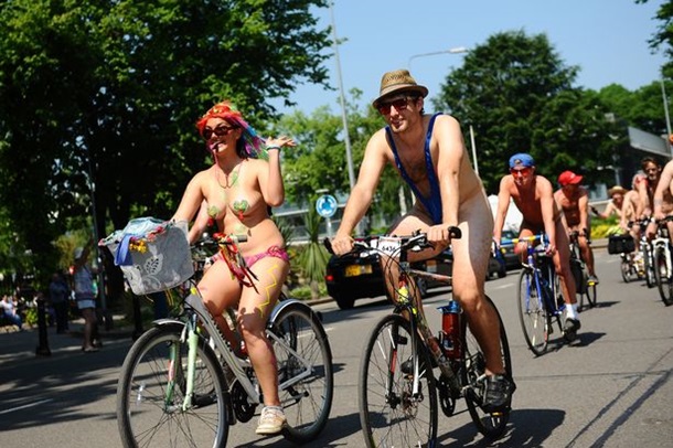 Деякі з велосипедистів були повністю оголені, більшість було одягнене лише частково.