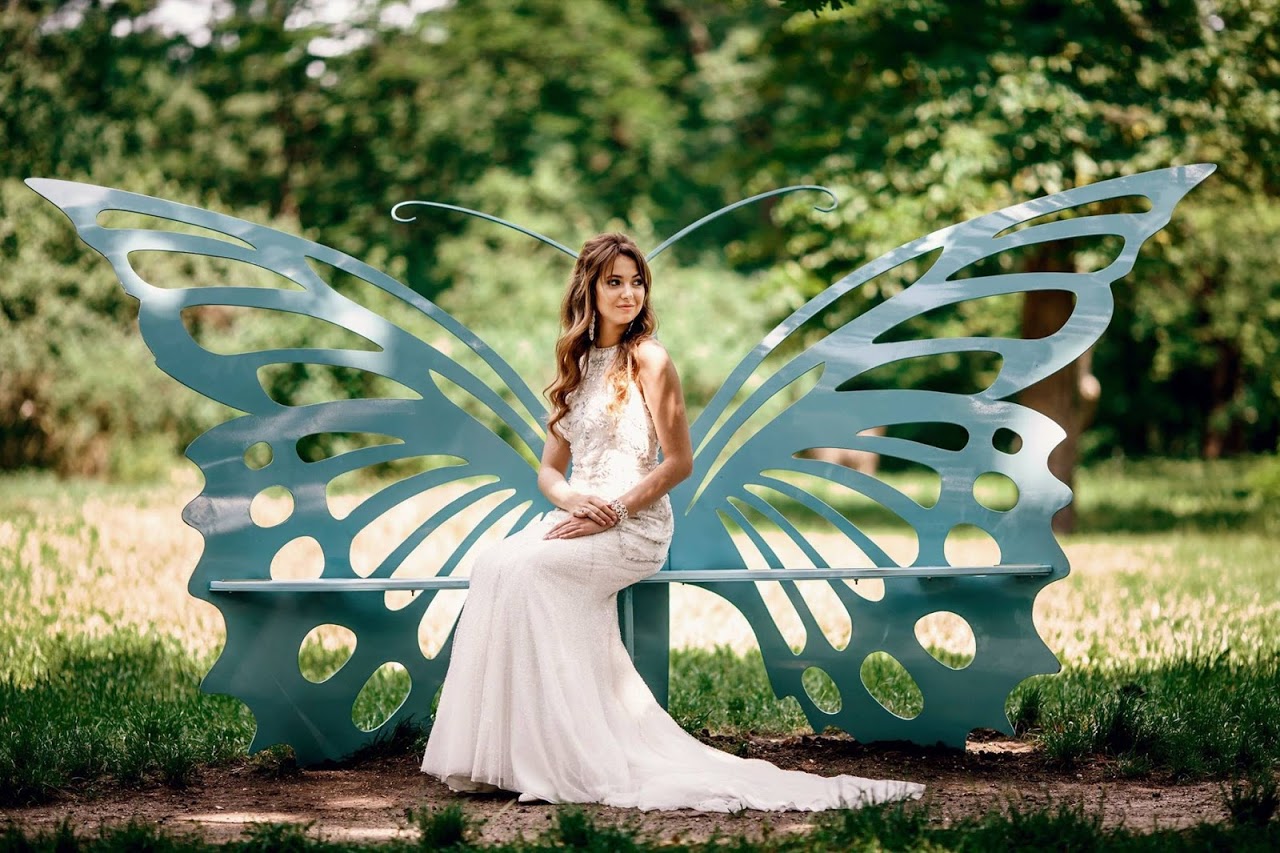 Спинка лавки виконана у вигляді величезного метелика. Основа лавки сталь, а обшивка з вологостійкої фанери. Ініціатор проекту Анатолій Кавун впевнений, що це не просто лава, а тепер ще й постійне місце для фото відвідувачів ботсаду.