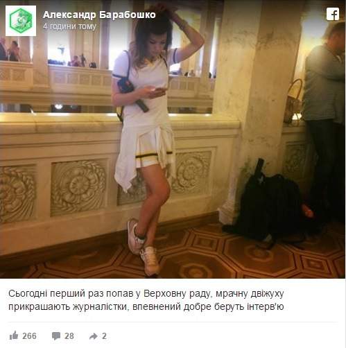 "Сьогодні вперше потрапив до Верховної Ради, похмуру движуху прикрашають журналістки, впевнений добре беруть інтерв'ю", - написав він.