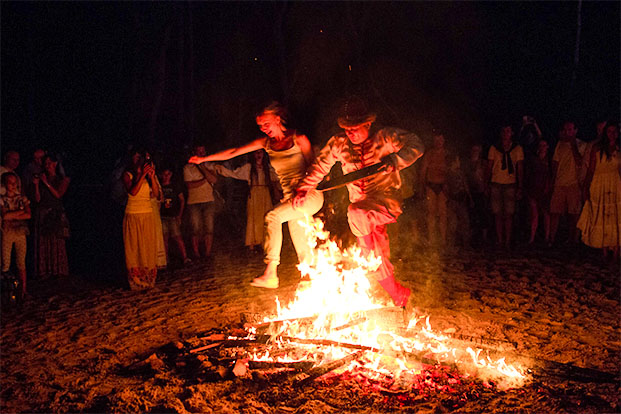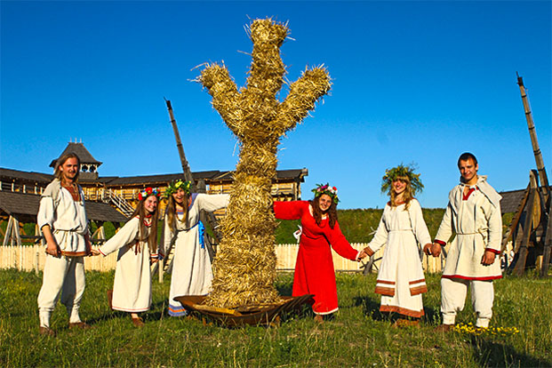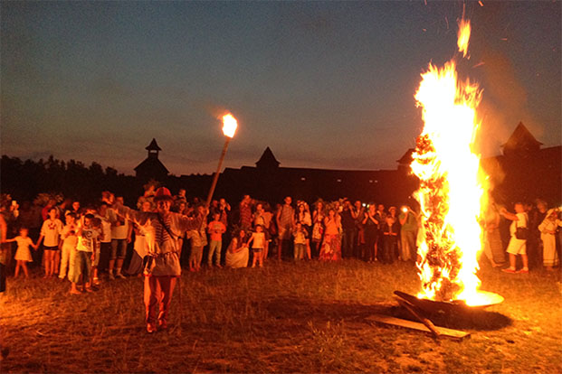 Вечірня програма буде яскравою в прямому сенсі слова, адже у Древньому Києві запалять багаття, і всі бажаючі зможуть стрибати через них – по одному або в парах. Апогеєм вогняних феєрій стане спалювання опудала Купала.