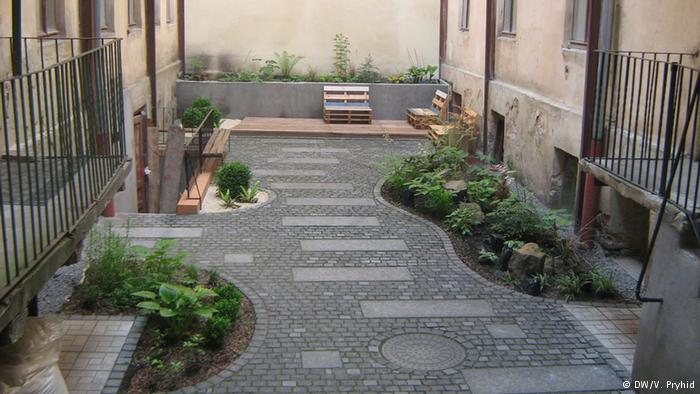 "Кущ бушману садили люди від GIZ, а цю папороть - уже наші жителі. Дизайнери показали, що і як садити, тепер люди вже самі докуповують квіти, кущі і саджають", - показує DW свій дворик Микола Волог, мешканець вулиці Мулярської у Львові. За його словами, сусіди задоволені реставрацією дворику, яку провели в рамках проекту Німецького товариства міжнародної співпраці GIZ: "Тепер приємно вийти у двір з горнятком кави, посидіти, побалакати з сусідами". Раніше подвір'я було вкрите потрісканим асфальтом і залишками фундаменту від старого будинку. Старе покриття тут зняли і зробили доріжки, посередині двору встановили спеціальну арку для трояндового куща, який тепер став окрасою дворика.