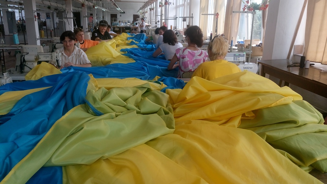 "В Ужгороді завершили пошиття національного прапора України завдовжки 100 метрів. Два рулони матерії синього і жовтого кольорів завширшки по 1,5 метра зшили працівниці Ужгородського учбово-виробничого підприємства №2 Українського товариства глухих (УТОГ).