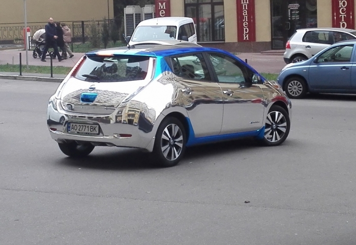 Власник авто обклеїв кузов блискучою плівкою, щоб Nissan виглядав хромованим. Ця марка –найпопулярніша в Україні серед електрокарів. Деякі власники всіляко намагаються виділитися на дорозі.