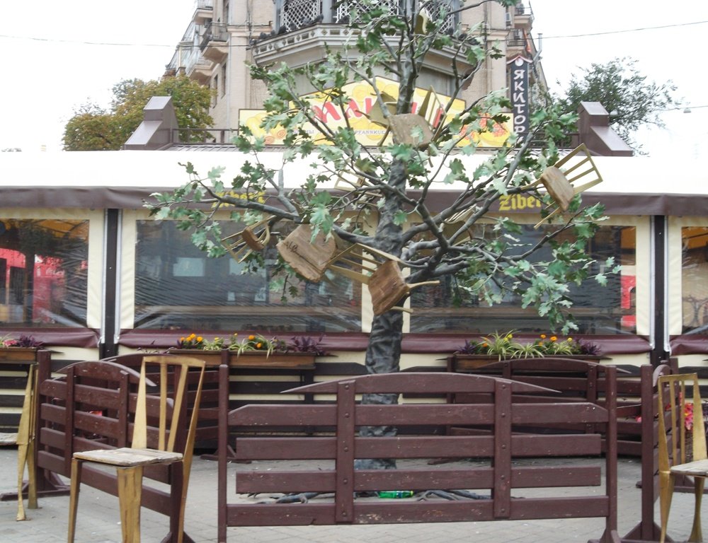 У Києві за останні роки створено безліч модернових та унікальних памятників. Одним із таких можна вважати чотириметровий металевий дуб, на гілках якого висять стільці, - це творіння художника-коваля Володимира Білоконя.